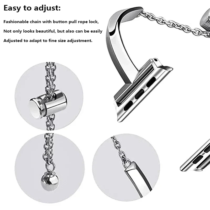 Upgrade your Apple Watch today with our Luxury Watch Band and experience the perfect blend of luxury and functionality. With its easy-to-use buckle clasp, you can easily switch out your old band and add a touch of elegance to your watch. Upgrade your style game and make a statement with the Luxury Watch Band for Apple Watch Series 8 7 41 45mm 6 Se 5 4 Women Diamond Steel Bracelet IWatch Ultra 49mm 44 40 42 38MM Strap.